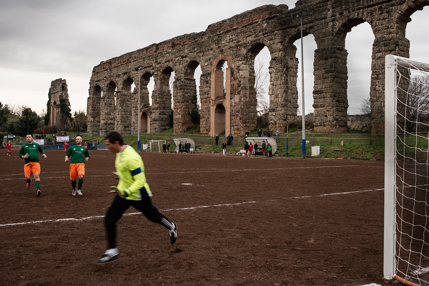 Soccer fields between via del Quadraro and Felice aqueduct, Aqueducts Parc, Rome, January 2015.